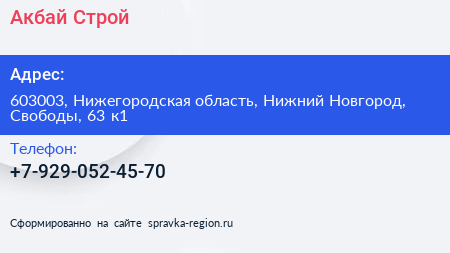 Акбай Строй по адресу 603003, Нижегородская область, Нижний Новгород, Свободы, 63 к1 в дальнейшем Организация, размещена в следующих категориях: