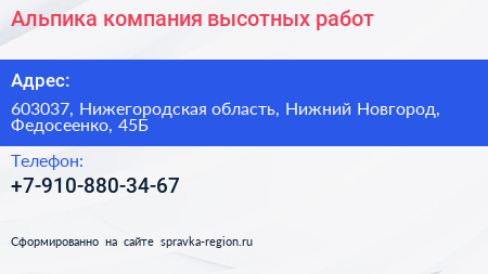 Альпика, компания высотных работ по адресу 603037, Нижегородская область, Нижний Новгород, Федосеенко, 45Б в дальнейшем Организация, размещена в следующих категориях: