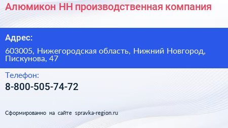 Алюмикон-НН, производственная компания по адресу 603005, Нижегородская область, Нижний Новгород, Пискунова, 47 в дальнейшем Организация, размещена в следующих категориях: