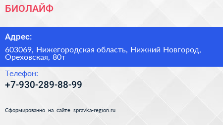БИОЛАЙФ по адресу 603069, Нижегородская область, Нижний Новгород, Ореховская, 80т в дальнейшем Организация, размещена в следующих категориях: