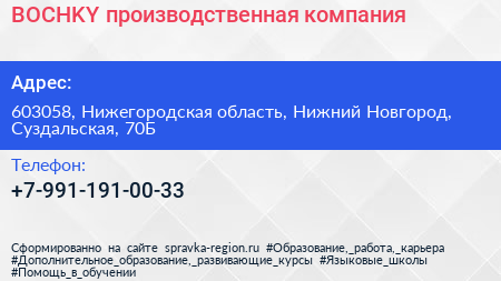 BOCHKY, производственная компания по адресу 603058, Нижегородская область, Нижний Новгород, Суздальская, 70Б в дальнейшем Организация, размещена в следующих категориях: