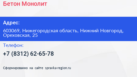 Бетон-Монолит по адресу 603069, Нижегородская область, Нижний Новгород, Ореховская, 25 в дальнейшем Организация, размещена в следующих категориях: