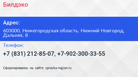 Билдэко по адресу 603000, Нижегородская область, Нижний Новгород, Дальняя, 8 в дальнейшем Организация, размещена в следующих категориях: