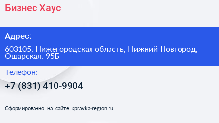 Бизнес Хаус по адресу 603105, Нижегородская область, Нижний Новгород, Ошарская, 95Б в дальнейшем Организация, размещена в следующих категориях: