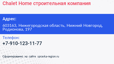 Chalet-Home, строительная компания по адресу 603163, Нижегородская область, Нижний Новгород, Родионова, 197 в дальнейшем Организация, размещена в следующих категориях: