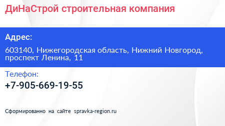 ДиНаСтрой, строительная компания по адресу 603140, Нижегородская область, Нижний Новгород, проспект Ленина, 11 в дальнейшем Организация, размещена в следующих категориях: