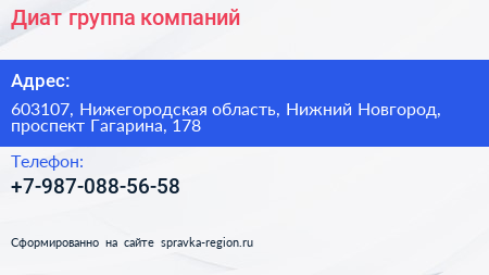 Диат, группа компаний по адресу 603107, Нижегородская область, Нижний Новгород, проспект Гагарина, 178 в дальнейшем Организация, размещена в следующих категориях: