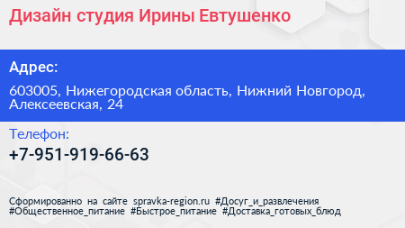 Дизайн-студия Ирины Евтушенко по адресу 603005, Нижегородская область, Нижний Новгород, Алексеевская, 24 в дальнейшем Организация, размещена в следующих категориях: