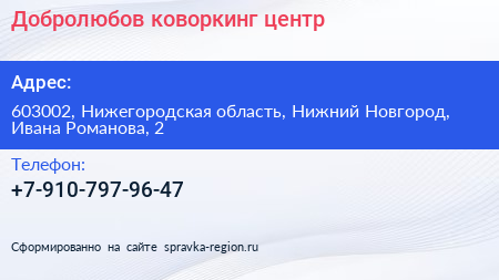Добролюбов, коворкинг-центр по адресу 603002, Нижегородская область, Нижний Новгород, Ивана Романова, 2 в дальнейшем Организация, размещена в следующих категориях:
