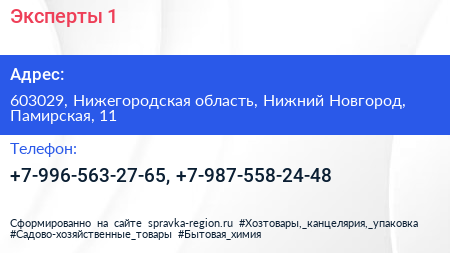 Эксперты№1 по адресу 603029, Нижегородская область, Нижний Новгород, Памирская, 11 в дальнейшем Организация, размещена в следующих категориях:
