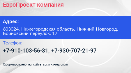 ЕвроПроект, компания по адресу 603024, Нижегородская область, Нижний Новгород, Бойновский переулок, 17 в дальнейшем Организация, размещена в следующих категориях: