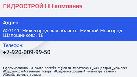 ГИДРОСТРОЙ-НН, компания по адресу 603141, Нижегородская область, Нижний Новгород, Шапошникова, 18 в дальнейшем Организация, размещена в следующих категориях: