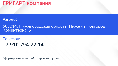 ГРИГАРТ, компания по адресу 603014, Нижегородская область, Нижний Новгород, Коминтерна, 5 в дальнейшем Организация, размещена в следующих категориях: