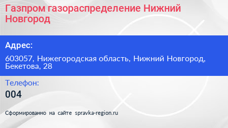 Газпром газораспределение Нижний Новгород по адресу 603057, Нижегородская область, Нижний Новгород, Бекетова, 28 в дальнейшем Организация, размещена в следующих категориях: