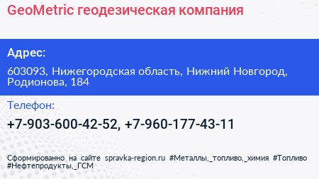GeoMetric, геодезическая компания по адресу 603093, Нижегородская область, Нижний Новгород, Родионова, 184 в дальнейшем Организация, размещена в следующих категориях: