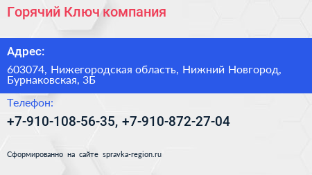Горячий Ключ, компания по адресу 603074, Нижегородская область, Нижний Новгород, Бурнаковская, 3Б в дальнейшем Организация, размещена в следующих категориях: