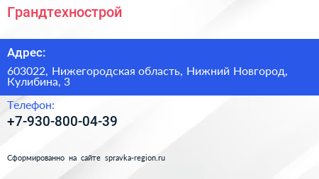 Грандтехнострой по адресу 603022, Нижегородская область, Нижний Новгород, Кулибина, 3 в дальнейшем Организация, размещена в следующих категориях: