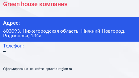 Green house, компания по адресу 603093, Нижегородская область, Нижний Новгород, Родионова, 134а в дальнейшем Организация, размещена в следующих категориях: