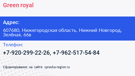 Green royal по адресу 607680, Нижегородская область, Нижний Новгород, Зелёная, 66в в дальнейшем Организация, размещена в следующих категориях: