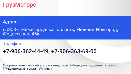 ГрузМоторс по адресу 603037, Нижегородская область, Нижний Новгород, Федосеенко, 45а в дальнейшем Организация, размещена в следующих категориях: