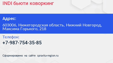 INDI, бьюти-коворкинг по адресу 603006, Нижегородская область, Нижний Новгород, Максима Горького, 218 в дальнейшем Организация, размещена в следующих категориях: