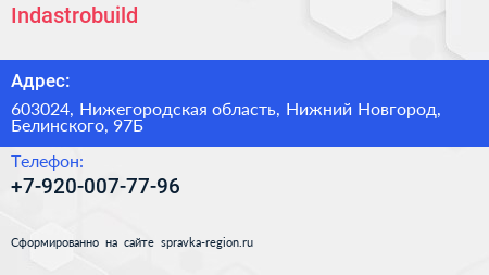 Indastrobuild по адресу 603024, Нижегородская область, Нижний Новгород, Белинского, 97Б в дальнейшем Организация, размещена в следующих категориях: