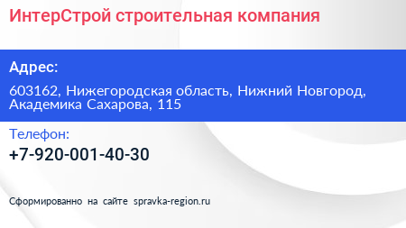 ИнтерСтрой, строительная компания по адресу 603162, Нижегородская область, Нижний Новгород, Академика Сахарова, 115 в дальнейшем Организация, размещена в следующих категориях: