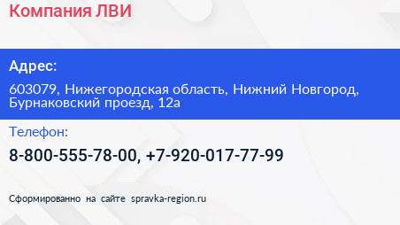 Компания ЛВИ по адресу 603079, Нижегородская область, Нижний Новгород, Бурнаковский проезд, 12а в дальнейшем Организация, размещена в следующих категориях: