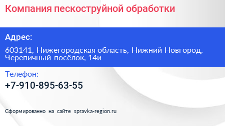 Компания пескоструйной обработки по адресу 603141, Нижегородская область, Нижний Новгород, Черепичный посёлок, 14и в дальнейшем Организация, размещена в следующих категориях: