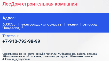 ЛесДом, строительная компания по адресу 603035, Нижегородская область, Нижний Новгород, Чаадаева, 5 в дальнейшем Организация, размещена в следующих категориях: