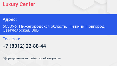 Luxury Center по адресу 603096, Нижегородская область, Нижний Новгород, Светлоярская, 38Б в дальнейшем Организация, размещена в следующих категориях: