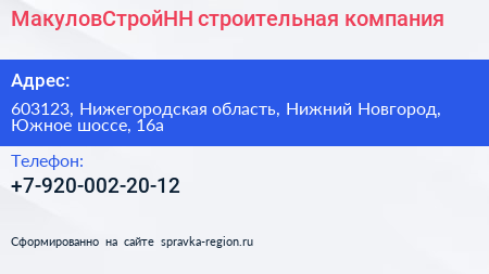 МакуловСтройНН, строительная компания по адресу 603123, Нижегородская область, Нижний Новгород, Южное шоссе, 16а в дальнейшем Организация, размещена в следующих категориях: