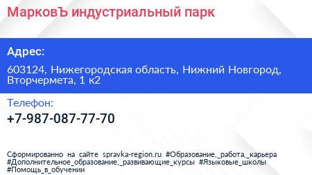 МарковЪ, индустриальный парк по адресу 603124, Нижегородская область, Нижний Новгород, Вторчермета, 1 к2 в дальнейшем Организация, размещена в следующих категориях: