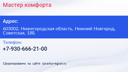Мастер комфорта по адресу 603002, Нижегородская область, Нижний Новгород, Советская, 18Б в дальнейшем Организация, размещена в следующих категориях:
