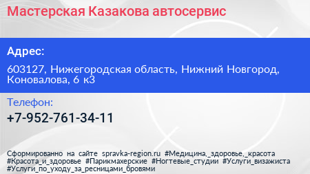 Мастерская Казакова, автосервис по адресу 603127, Нижегородская область, Нижний Новгород, Коновалова, 6 к3 в дальнейшем Организация, размещена в следующих категориях: