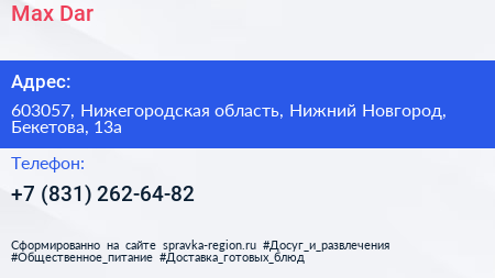 Max Dar по адресу 603057, Нижегородская область, Нижний Новгород, Бекетова, 13а в дальнейшем Организация, размещена в следующих категориях: