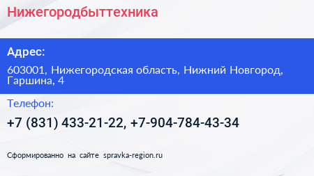 Нижегородбыттехника по адресу 603001, Нижегородская область, Нижний Новгород, Гаршина, 4 в дальнейшем Организация, размещена в следующих категориях: