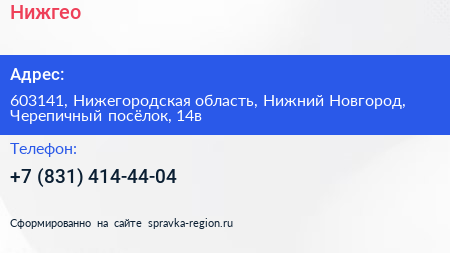 Нижгео по адресу 603141, Нижегородская область, Нижний Новгород, Черепичный посёлок, 14в в дальнейшем Организация, размещена в следующих категориях: