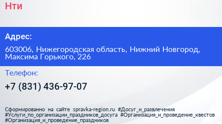 Нти по адресу 603006, Нижегородская область, Нижний Новгород, Максима Горького, 226 в дальнейшем Организация, размещена в следующих категориях: