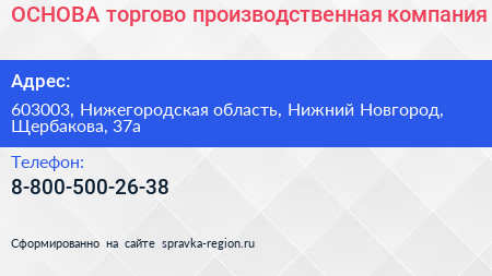 ОСНОВА, торгово-производственная компания по адресу 603003, Нижегородская область, Нижний Новгород, Щербакова, 37а в дальнейшем Организация, размещена в следующих категориях: