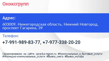 Онэксгрупп по адресу 603009, Нижегородская область, Нижний Новгород, проспект Гагарина, 39 в дальнейшем Организация, размещена в следующих категориях: