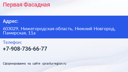 Первая Фасадная по адресу 603029, Нижегородская область, Нижний Новгород, Памирская, 11а в дальнейшем Организация, размещена в следующих категориях: