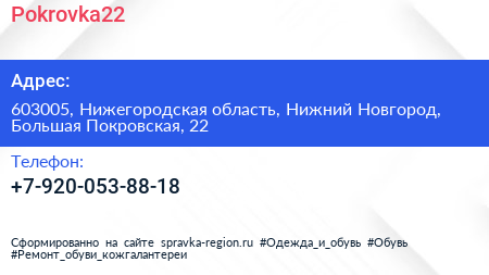 Pokrovka22 по адресу 603005, Нижегородская область, Нижний Новгород, Большая Покровская, 22 в дальнейшем Организация, размещена в следующих категориях:
