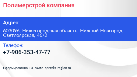 Полимерстрой, компания по адресу 603096, Нижегородская область, Нижний Новгород, Светлоярская, 46/2 в дальнейшем Организация, размещена в следующих категориях: