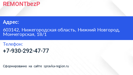 REMONTbezP по адресу 603142, Нижегородская область, Нижний Новгород, Мончегорская, 18/1 в дальнейшем Организация, размещена в следующих категориях: