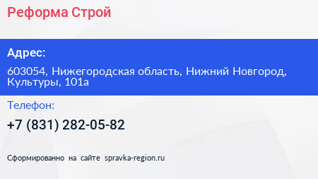 Реформа Строй по адресу 603054, Нижегородская область, Нижний Новгород, Культуры, 101а в дальнейшем Организация, размещена в следующих категориях: