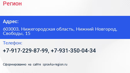 Регион по адресу 603003, Нижегородская область, Нижний Новгород, Свободы, 15 в дальнейшем Организация, размещена в следующих категориях: