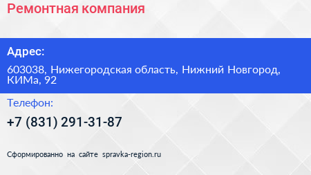 Ремонтная компания по адресу 603038, Нижегородская область, Нижний Новгород, КИМа, 92 в дальнейшем Организация, размещена в следующих категориях: