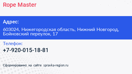 Rope Master по адресу 603024, Нижегородская область, Нижний Новгород, Бойновский переулок, 17 в дальнейшем Организация, размещена в следующих категориях: