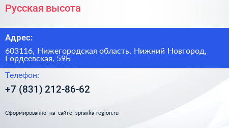 Русская высота по адресу 603116, Нижегородская область, Нижний Новгород, Гордеевская, 59Б в дальнейшем Организация, размещена в следующих категориях: